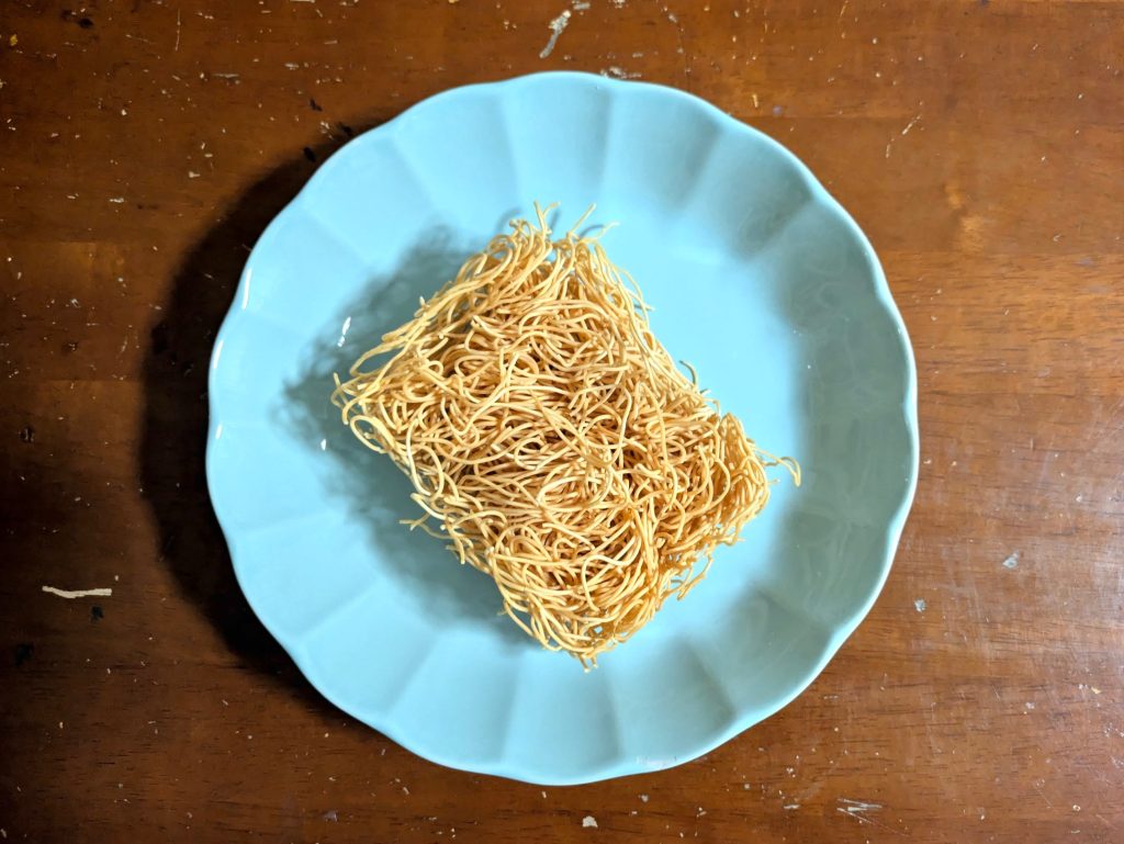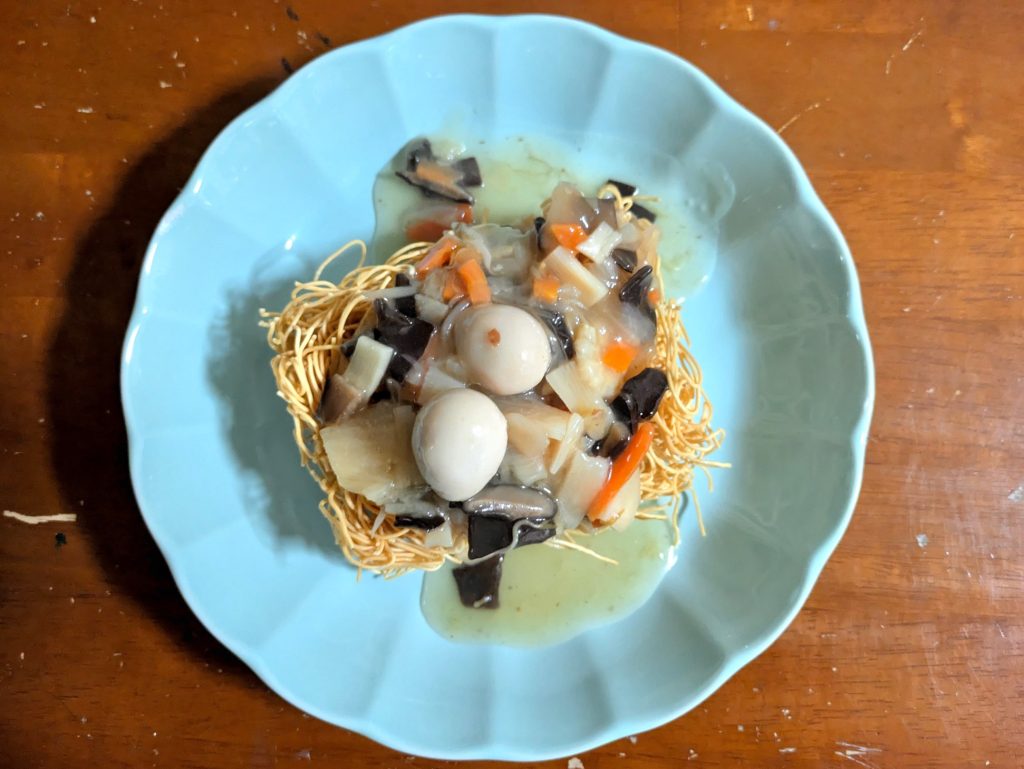 簡単に言うと、チキンラーメンみたいなパリパリの麺に、餡をかけて食べる料理です。